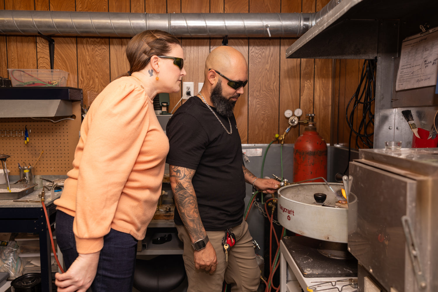 We'll determine your ring sizes, how wide and what shape your rings will be, and what kind of style you're interested in in order to give you an estimate for your material costs.