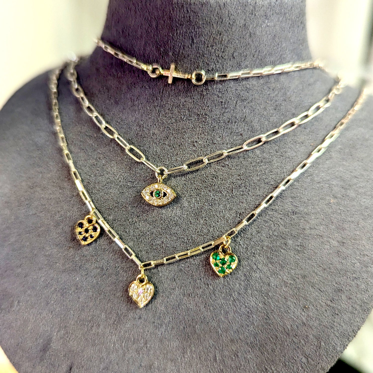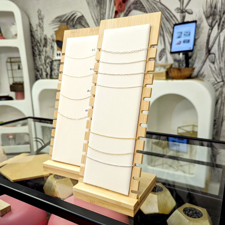 Katie has various styles of chain available in both Sterling Silver and solid 14K yellow gold to choose from, as well as a selection of charms. Clients can try on multiple styles to help decide what looks best and best fits their budget.