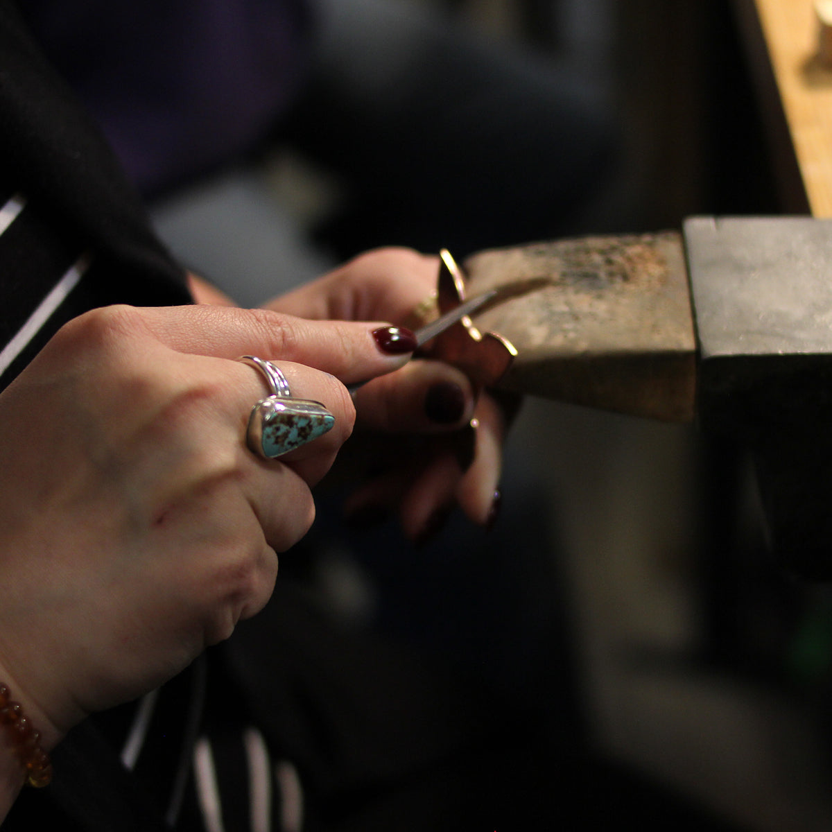 Beginner classes cover sawing, soldering, basic texturing, annealing, and basic forming.