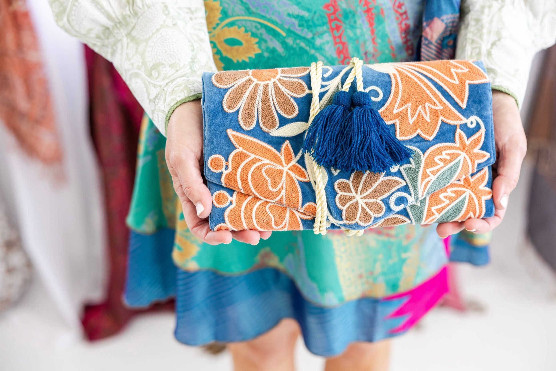 Embroidered Velvet Jewelry Organizer - Blue Botanical